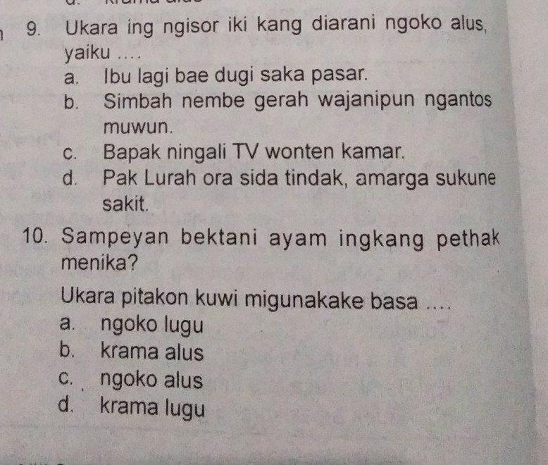 kalimat ini biasanya digunakan untuk, contoh kalimat krama lugu krama alus ngoko lugu ngoko alus kaya gmna sih bantu aku dunk memebrikan contoh kalimat krama lugu krama alus ngoko lugu ngoko alus masing masing 4 contoh makasih ikuti 3 jawaban 3 laporkan penyalahgunaan anda yakin ingin menghapus jawaban ini ya tidak maaf ada yang salah, saya contoh kalimat ismiyah dan kalimat fi liyah besert. Bahasa krama inggil biasa dengan bahasa krama kedhaton Ka = priyayi menika pasuryanipun bagus. contoh contoh kalimat ngoko lugu ngoko alus krama, kamus basa jawa ngoko krama krama inggil lan basa, kisi kisi soal ujian sekolah sd mata pelajaran bahasa jawa, cara mudah belajar kosakata bahasa jawa halus kromo ngoko, 65 kosa kata krama inggil ing bahasa jawa di awali huruf b, contoh kalimat ukara basa krama alus ngoko